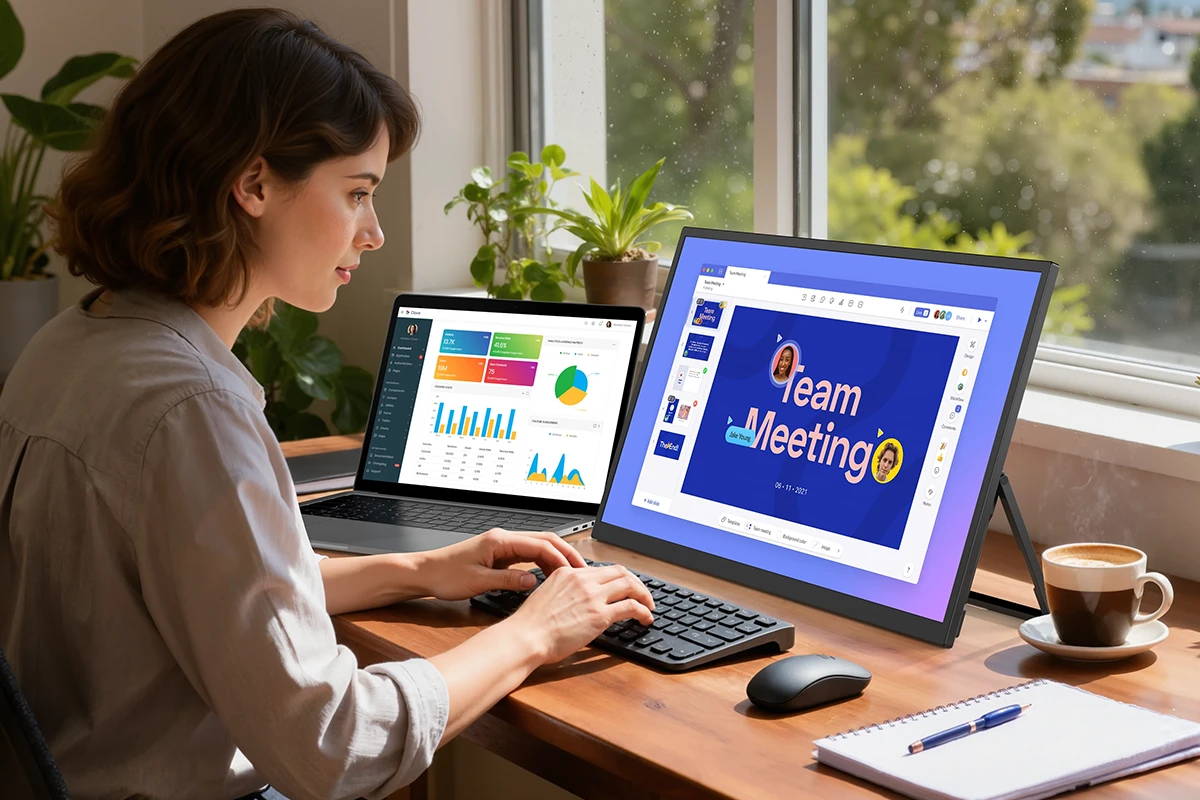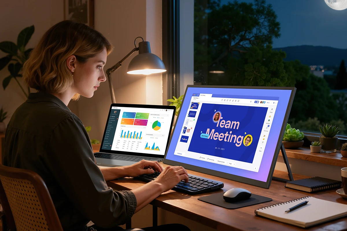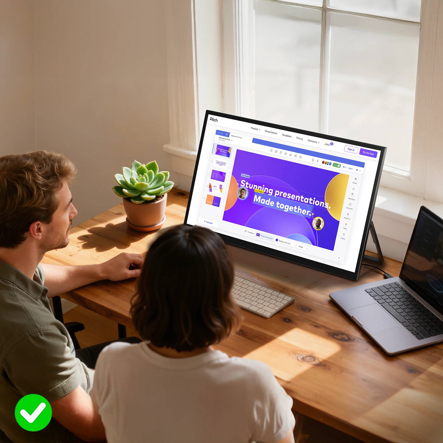 Most traditional LCD displays look best straight on. From wider angles, brightness can drop and colors may shift, reducing visual comfort and impacting the screen-sharing experience.