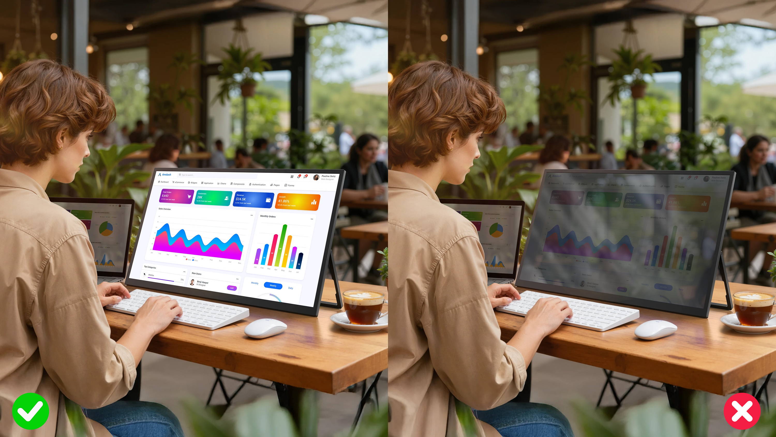 Whether you’re at a café, airport, or camping under the open sky, your display remains sharp, readable, and free from reflections.